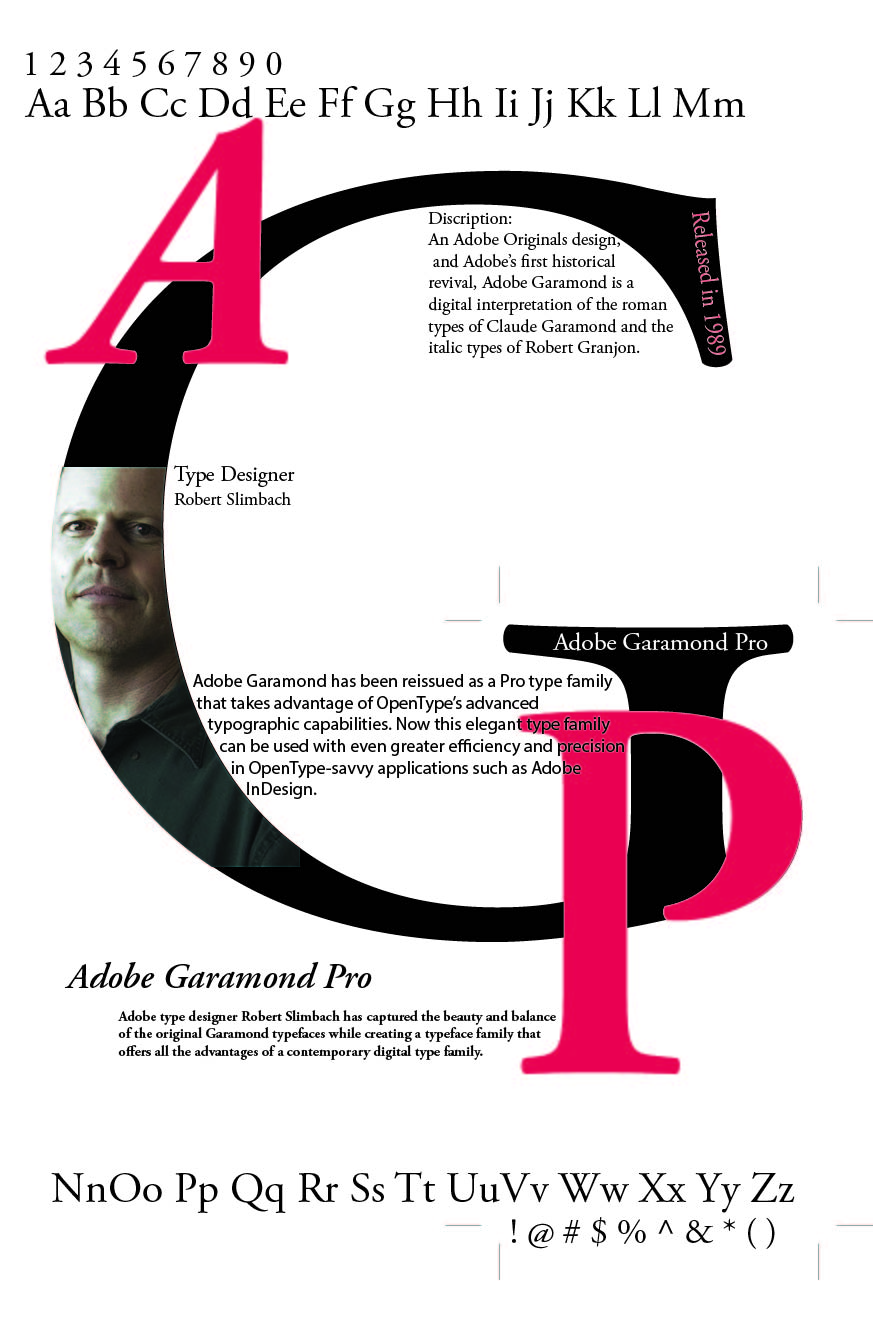 A great example is the following week two assignment on typography. I really liked this assignment. The feedback that I really took to heart was to go extra to get a better result. I used a photograph of the designer of the typeface Adobe Garamond Pro and his head was cut off near the top. I went back and found a picture of his full head and that indeed make for a much better final product.
