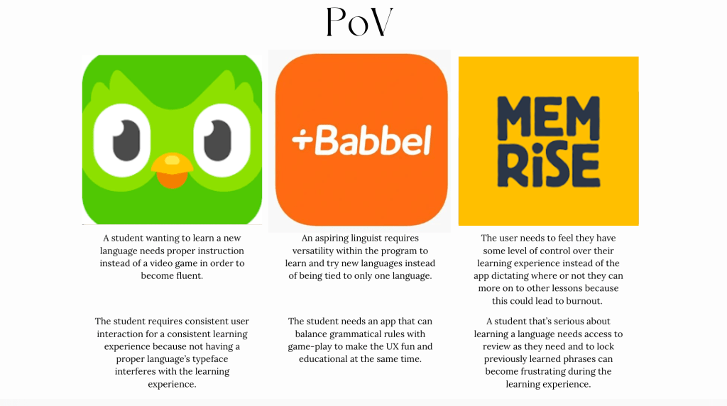 Once you have a grasp at problem statements you need to dig a little deeper with a point of view (POV), which searches for three elements; a user, a need, and insight. A format to guide you in writing a POV statement is: